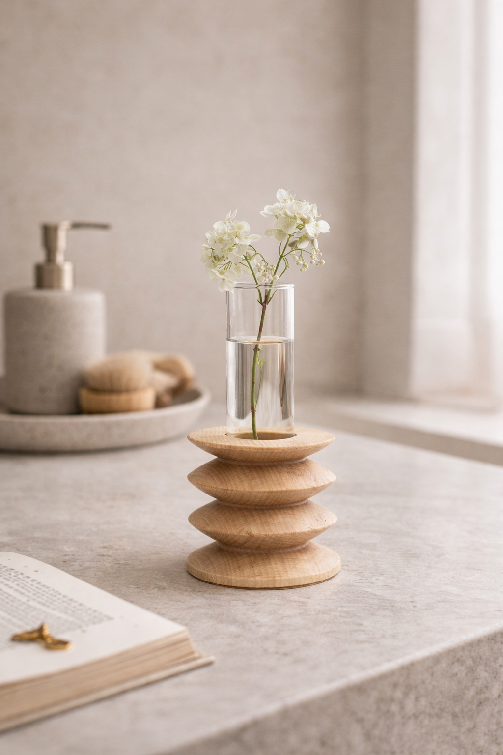 Jarrón de madera de haya Totem corto con tubo de vidrio | Artesanía portuguesa
