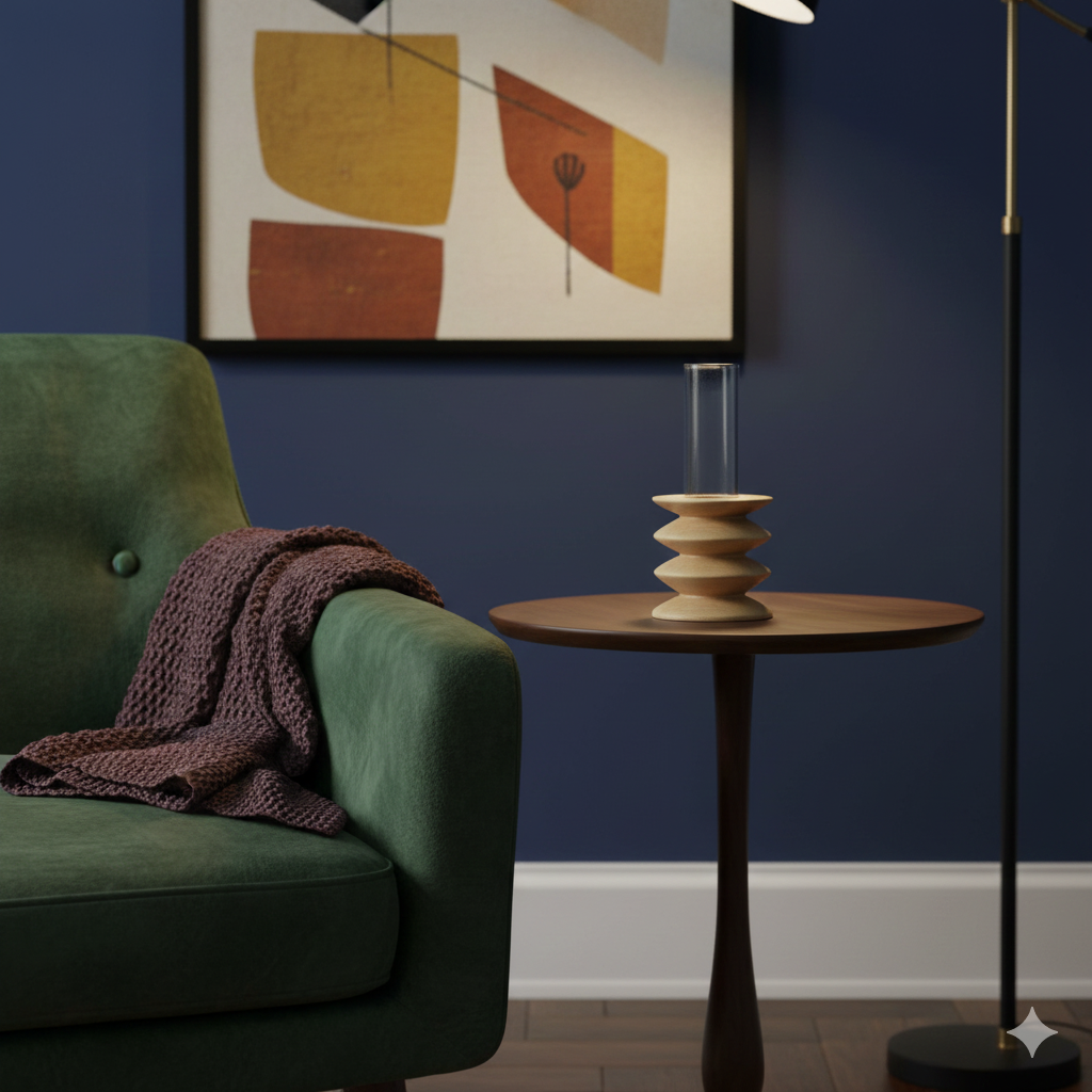 La base está realizada en madera maciza de haya, protegida con un barniz ecológico que conserva la textura natural y aporta durabilidad. Incorpora un tubo de vidrio extraíble, apto para lavavajillas, que facilita la limpieza y el uso diario.